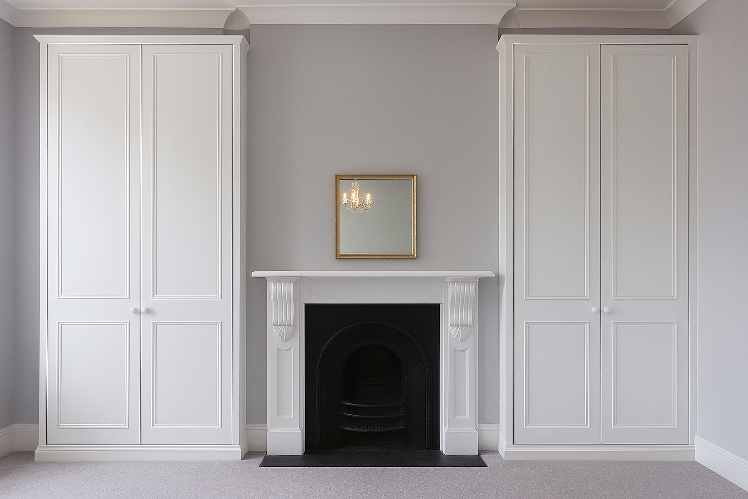 Alcove wardrobes with additional doors on top. Egger board inside and spray painted outside in any colour desired. Fitting included.
